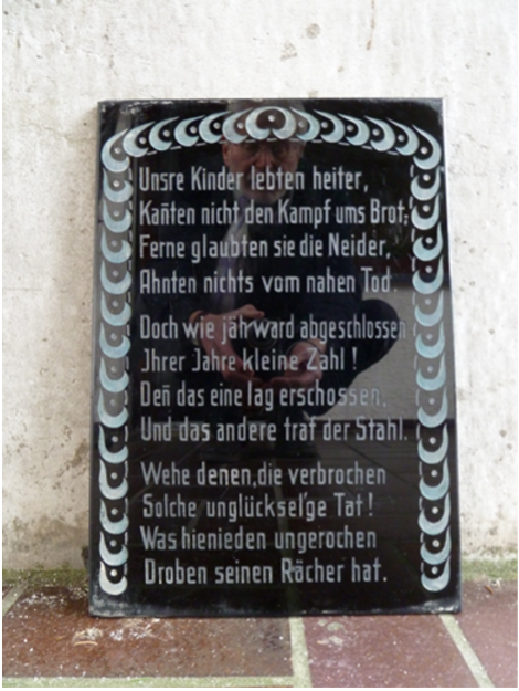 Zum Gedenken an den Verlust ihrer beiden Kinder, die tragisch ums Leben gebracht worden waren, hatte also das Ehepaar Schmid einen Grabstein mit besagter Glastafel setzen lassen, die all die Jahrzehnte überdauerte.