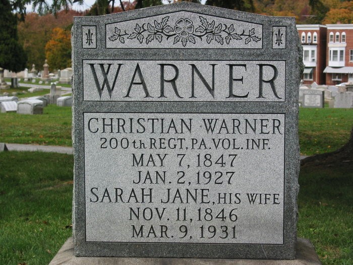Sein Sohn Christoph, in Hohengehren am 7. Mai 1847 zur Welt gekommen und in späteren Quellen nur noch als Christian Warner geführt, verdiente sein Geld zunächst als Arbeiter und lebte in York Borough, York County. Der Heranwachsende wurde am 11. August 1864 in New York zum Militär eingezogen, ob er dabei sein korrektes Alter angab und vielleicht die Zustimmung der Eltern besaß, ist nicht bekannt. In Harrisburg wurde der 1,63 Metern (5‘4‘‘) große Warner, der „sandfarbenes“ Haar und braune Augen gehabt haben soll, am 20. August zur A-Kompanie des neuaufzustellenden 200. Pennsylvania Infanterie-Regiments eingezogen, das auf Seiten der Union kämpfte. Er nahm unter anderem an den Kämpfen vor Petersburg in den ersten drei Apriltagen 1865 teil und wurde am 30. Mai 1865 in Alexandria (Virginia) mit der Einheit ehrenvoll aus dem Dienst entlassen. Da lebte sein Oberster Befehlshaber, Präsident Abraham Lincoln, bereits seit eineinhalb Monaten nicht mehr. Lincoln war nach einem Attentat während eines Theaterbesuchs am 14. April so schwer verletzt worden, dass er tags darauf verstorben war. Warner setzte ab 1867 die Tradition seines Großvaters und Vaters fort und arbeitete nun als Schmied. Im Alter von 20 Jahren heiratete er am 5. März 1868 die unwesentlich ältere Sarah Jane Smith und wurde Vater von fünf Kindern. In einem zeitgenössischen Werk aus dem Jahr 1886 liest man: „Mr. Warner has been inspector of elections for his ward for six years … and for four years was a trustee of the Laurel Fire Company. He is an active Republican, and was an officer of the Young Men’s Republican Club in 1880.“ Warners Todestag ist der 2. Januar 1927, seine Ehefrau verstarb vier Jahre später. Das Ehepaar fand seine letzte Ruhestätte auf dem Prospect Hill Cemetery ihres Wohnortes York, dort waren schon Conrad und Barbara Warner 1883 bzw. 1885 bestattet worden.