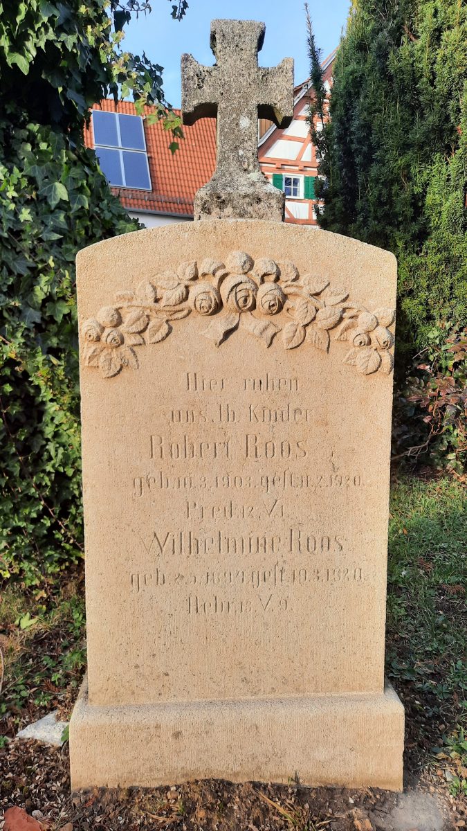 „Der Mensch ist erst dann tot, wenn niemand mehr an ihn denkt.“ Dieses Zitat wird dem bekannten Dramatiker und Lyriker Bertolt Brecht zugeschrieben. Mit dem Wegwerfen von Fotografien bei Haushaltsauflösungen oder dem Abräumen alter Grabstätten verschwindet zumeist die Erinnerung an die Personen, die einstmals in einem Ort lebten. Auch auf dem Hohengehrener Friedhof findet man so gut wie keine alten Grabsteine mehr, einer der wenigen sticht jedoch durch seine kunstvolle Gestaltung und seinen wie neu wirkenden Zustand sogleich ins Auge. Die Inschrift des über 100 Jahre alten Grabsteins weist darauf hin, dass Eltern zwei ihrer Kinder Anfang 1920 innerhalb weniger Wochen verloren hatten: Hier ruhen uns. lb. Kinder Robert Roos geb. 10.3.1903 gest. 11.2.1920 Pred. 12. V. 1. Wilhelmine Roos geb. 2.5.1894 gest. 19.3.1920 Hebr. 13. 13. V. 9.