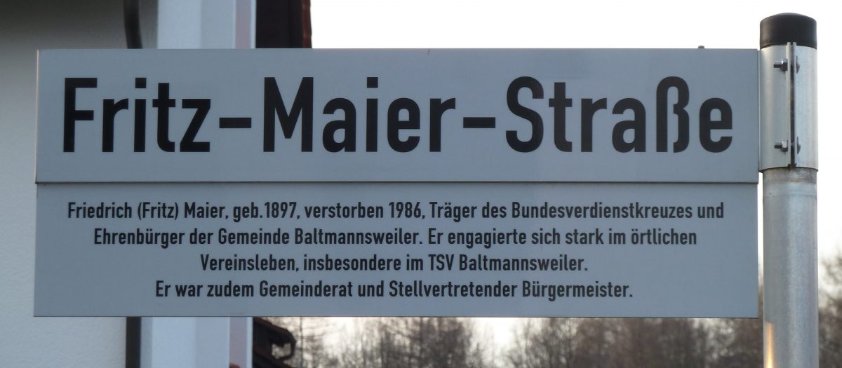 Steffi Graf hat eine, auch Dietmar Hopp hat eine – nämlich eine Straße, die nach ihnen benannt ist, und zwar in Landshut bzw. Sinsheim. Üblicherweise ehren aber Kommunen keine lebenden Personen mit Straßennamen, sondern nur verstorbene. Die Benennung soll eine besondere Ehrung der jeweiligen Person darstellen, deshalb sind Persönlichkeiten zu wählen, die für die Öffentlichkeit von besonderer Bedeutung waren oder noch sind. In Baltmannsweiler gibt es in der Schurwaldsiedlung ein solches Straßenschild, sogar mit einem Zusatzschild versehen, auf dem knappe Angaben zur Biografie des somit geehrten Fritz Maier zu lesen sind.