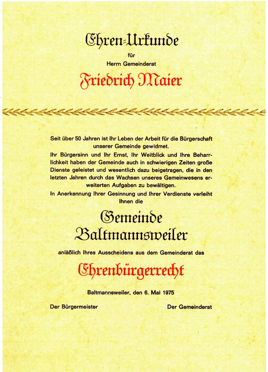 Für sein vielfältiges Engagement in der Schurwaldgemeinde erhielt Maier Ende 1973 den Bundesverdienstorden am Bande und zwei Jahre später die Ehrenbürgerrechte nach einstimmigem Beschluss des Gemeinderats vom 7. Mai 1975. Die Verleihung der Ehrenbürgerrechte nahm der neugewählte Bürgermeister Roland Keim als seine erste Amtshandlung vor. Maier bedankte sich und führte aus, „daß bei seiner ehrenamtlichen Tätigkeit immer das Wohl der Gemeinde im Vordergrund gestanden habe, sein Leitsatz sei gewesen, ehrlich sei der Mensch und gut“. Die Ehrung erlebte Maiers Gattin Emilie nicht mehr, sie war bereits am 4. Februar 1965 im Alter von 66 Jahren in Baltmannsweiler verstorben, der Ehemann folgte ihr am 19. April 1986 in Plochingen. Mitte der 90er Jahre wurde schließlich noch die besagte Straße in der Schurwaldsiedlung nach ihm benannt. (auh) Erschienen in DORFNACHRICHTEN aktuell Nr. 17 vom 17.04.2025