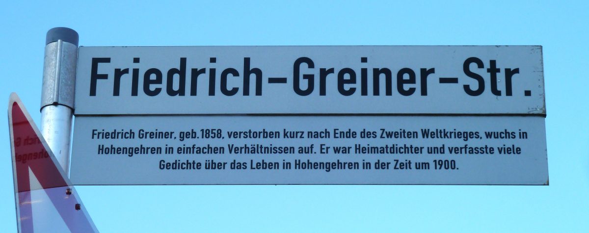 In Hohengehren gibt es zwei Straßen, die nach Personen benannt sind, auf die die Gemeinde stolz ist, eine ist die Friedrich-Greiner-Straße in der Ortsmitte. Von dem Namensgeber wird den allermeisten in dem Ort Lebenden lediglich das bekannt, was als Zusatz auf dem Straßenschild vermerkt ist: Greiner wurde 1858 in Hohengehren geboren und wuchs in einfachen Verhältnissen auf. Er war ein Heimatdichter und verfasste viele Gedichte über das Leben in seinem Geburtsort in der Zeit um 1900. Er verstarb kurz nach Ende des Zweiten Weltkrieges. Auch das Internet, die primäre und für viele Menschen auch einzige Informationsquelle unserer Tage, bietet so gut wie keine weitergehenden Angaben zu ihm, sodass die Hilfe des Heimatbuches von Erwin Mauz und verschiedener Archive in Anspruch genommen werden musste, um ein einigermaßen klares Bild seines Lebens zu erhalten.