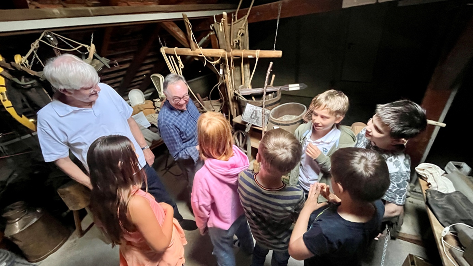 Die 17 Jungen und Mädchen zeigten sich nämlich überrascht und beeindruckt von der Menge der gelagerten Gegenstände aus den Bereichen Schule, Handwerk, Landwirtschaft und Gewerbe. Sie stellten immer wieder Fragen, die Karl-Heinz Neef, Vorsitzender des Vereins, ausführlich und überaus freundlich beantworten konnte. Ein Junge wünschte sogar, in jener zurückliegenden Zeit gelebt zu haben, er wurde aber doch nachdenklich bei dem Gedanken, auf welche (vor allem technische) Errungenschaften der Gegenwart er hätte verzichten müssen. Für alle Beteiligten war der Besuch des Dachbodens und seiner Schätze ein Erlebnis, das es in Zukunft zu wiederholen gilt.